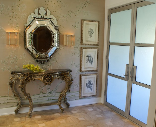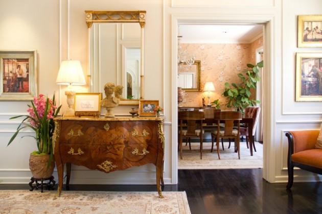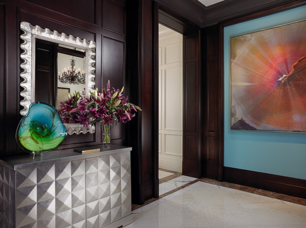 In the small apartments and houses mirror is a practical element that visually enhances the space. It is the most commonly used detail in the hall as for aesthetic and functional reasons. To avoid narrowing of the small space, you should avoid large pieces of furniture. Instead, set a narrow shelf on the wall or commode that will separate the other space from the passage. Above or behind the commode set the mirror in an interesting frame. This corner will be complete with a table lamp or interesting vase with flowers.