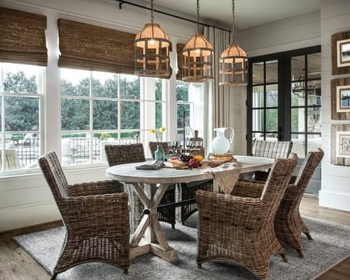 2. Rustic radiance. This rustic farmhouse-inspired dining room uses a wealth of materials to create a well-layered look. Wicker Key Largo chairs, repurposed galvanized steel, burlap chandeliers and grasscloth blinds complement one another while adding multiple textures to the space.