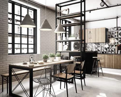 3. Industrial elegance. This industrial loft embraces its features to the fullest. Instead of trying to divert attention from the exposed pipes and factory-style windows, the decor decisions double down on them. The dining table, chairs and bench all feature blackened-steel legs; a large steel bookshelf serves as a stylish room divider; and the black and white concrete tiles in the kitchen backsplash add an exciting pattern that complements the room’s color scheme.
