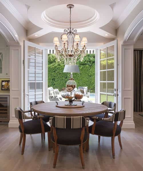 4. A round of applause. Having your furniture selections mimic a room’s architectural details often makes for a pleasing visual. This Los Angeles dining room makes the most of its decorative ceiling with a round dining table directly underneath the circular molding.