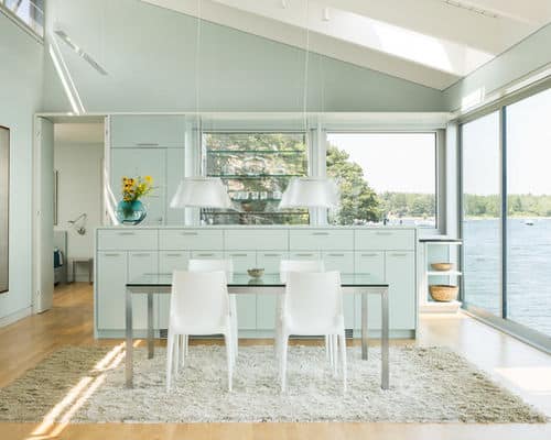 5. Sea foam sensation. This Maine dining room features a killer view of the Atlantic, and the space pays homage with its walls and cabinetry painted in sea foam green. The glass-topped dining table and clear pendant lights add to the fresh, airy feel of the room.