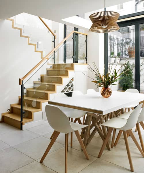 6. White and wood wonder. Designer Clare Gaskin embraced and amplified the wood stairs and white tile floors in this London dining room. The stylish pendant light and similarly hued wood legs of the dining table and chairs mix well with the crisp white walls, chair seats and tabletop. Sometimes two tones is all you need to make a room a standout.
