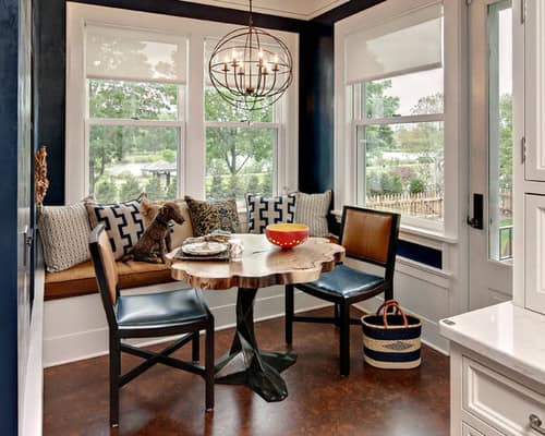 7. Chic corner. This kitchen corner in a Minneapolis showcase house is a great example of making the most of limited space. Design Forty Five outfitted a built-in bench with an assortment of cozy and stylish pillows. The dining table features a custom base created by Tristan Thiel and a live-edge wood top.