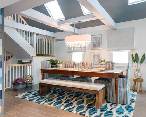 8. Striped stunner. Lines, lines, everywhere lines. From the ceiling rafters to the stair railing to the wall panels and the stripes on the slipcovered chairs, this New Hampshire dining room designed by the team at New England Design Elements has stripes and then some. Thanks to the various shades of blue used as a grounding force, the lines don’t overwhelm.