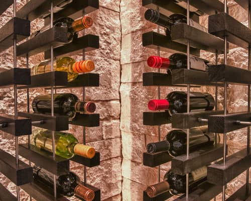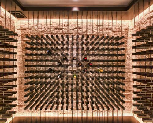 Bottle display has certainly jumped from being strictly functional to offering an elaborate design element. This cellar in Massachusetts has Texas limestone walls behind the bottles, lit with LEDs from above and below. The racks themselves are made of steel and wood blocks. The modern grid, lighting and steel bring in the new, while the limestone walls and travertine floor nod to classic wine storage spaces.