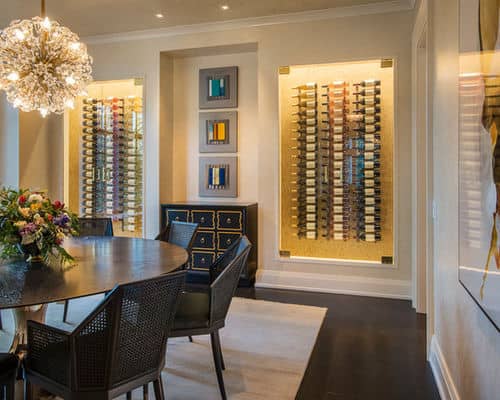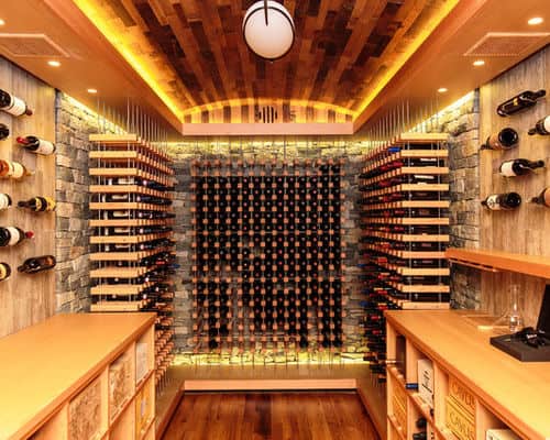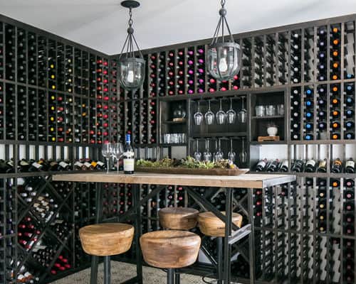 A place to uncork and unwind within the wine cellar has been trending for years. This particular wine room has strong contrast between the white ceiling and walls and the dark wood racks, which gives it a more contemporary look.