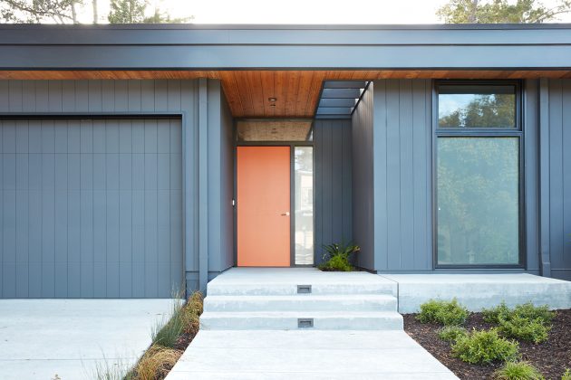 The atrium and rear yard patio, enhanced by Growsgreen’s landscape design, frame the glassy living room on both sides, creating a sense of visual openness and allowing light to flood into the space. New natural wood siding flows from inside to outside, echoing one of the classic Eichler design elements while giving it a fresh, warm update.