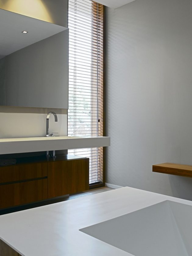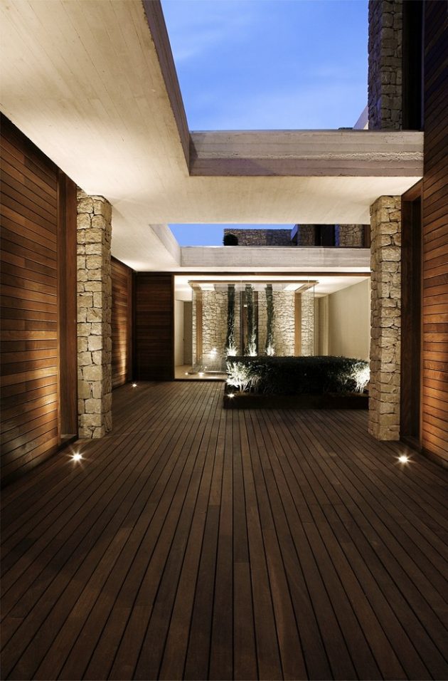 The horizontality of the design is emphasized by stone planes capped with white concrete slabs, enclosed by membranes of glass and wood. Floor-to-ceiling glazing opens interiors to natural light and panoramic views, while porches extend toward the pool, reflecting the house in the water and producing a theatrical interplay of surfaces and shadows.