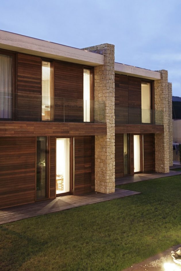 Two vertical elements punctuate this horizontality: wooden chimneys that rise above the property, reinforcing the architectural rhythm and providing a striking counterpoint to the horizontal slabs.