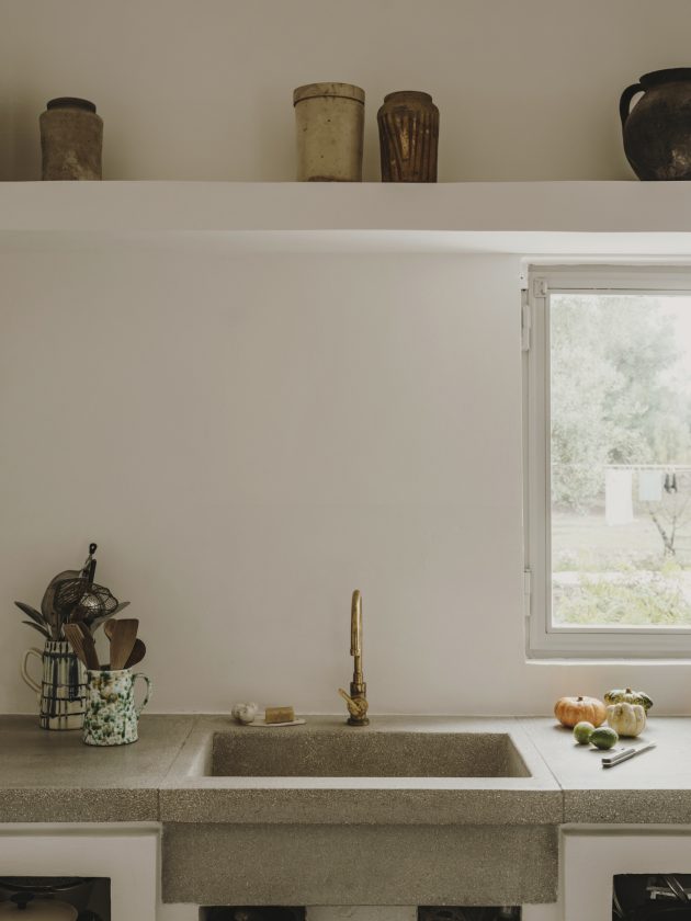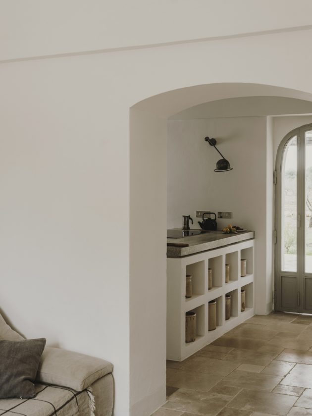 All these whitewashed walls meet stone floors and laid-back, linen-covered sofas. And now, on the photo below you can see that walking through the archway you get into the villa’s kitchen.