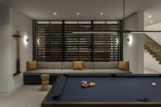 The clients own an extensive wine collection, so the climate-controlled wine room, with blackened steel supports and custom walnut shelving, was a must-have and is used as a backdrop to a custom banquette in the adjacent game room. Surrounded by pristine woods and clad in cedar, this is a project that celebrates the forest and all its delights.