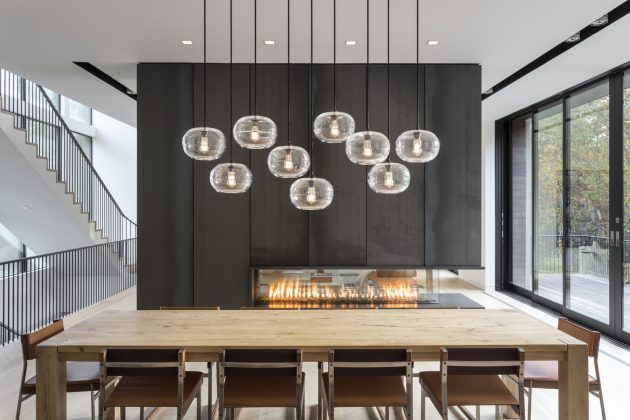 The airy interiors draw from the owners’ interest in loft-like living with a refined edge. Early in the design process, we established the interior staircase as a central sculptural element that weaves all three levels together. A three-sided fireplace clad in blackened steel punctuates the open plan of the living, dining and kitchen areas and establishes zones for each purpose.