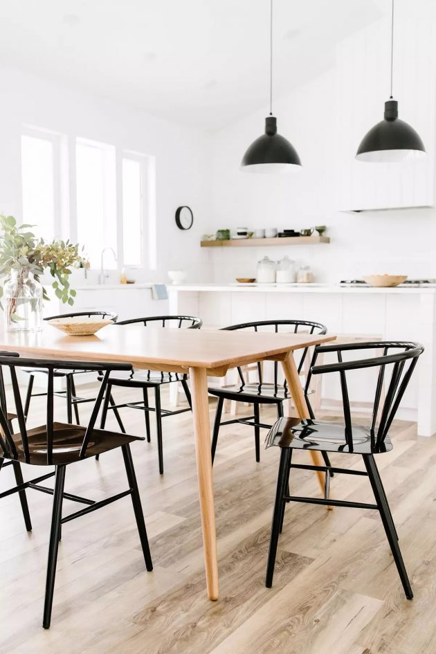 The focal point of the kitchen are the over-sized black pendants that pop against the white backdrop.