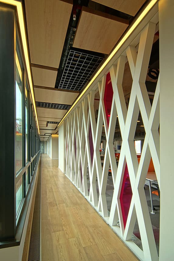 OSO Architecture followed mainly the open plan office principles while designing the working areas. However, in order to minimize some disadvantages of open plan design; such as acoustic and repetition problem of working tables; some precautions had been taken by OSO Architecture. Which, some social areas like a lounge and library were integrated among the working areas. Furthermore, special rock wool panels were used on the ceiling as a suspended ceiling material, in order to reach the acoustic comfort into the open office spaces.