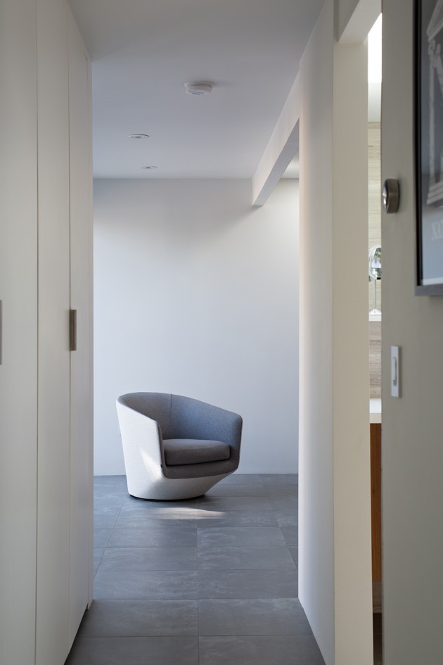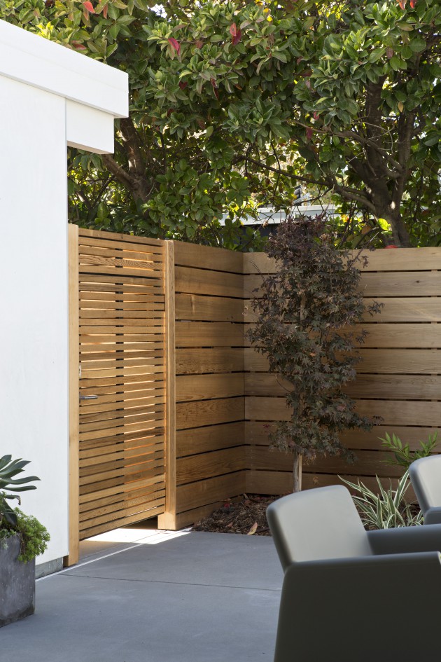 Cedar siding wraps the wooden volumes, contrasting with a smooth white stucco band that cuts through the house, extending from exterior to interior and back again. This continuous surface defines the central void and enhances the architectural clarity.
