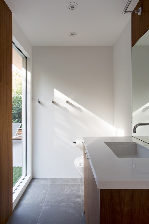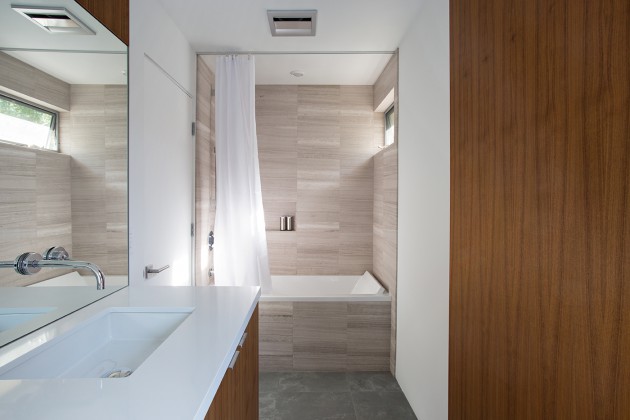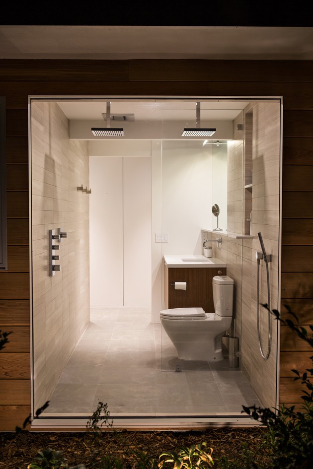 At the rear, the bedroom and bathroom wing retains privacy while maximizing openness. The master bath features a full glass wall in the shower, offering views of the landscaped backyard and delivering the experience of showering outdoors, all within the safety and comfort of home.