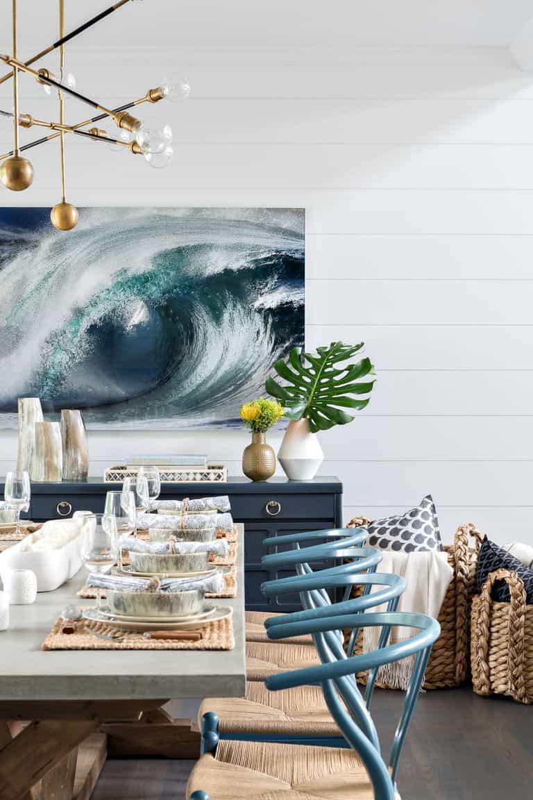 Wonderful welcoming touch of a beachy palette of blue and white in this dining room in a Bridgehamptin summer home.