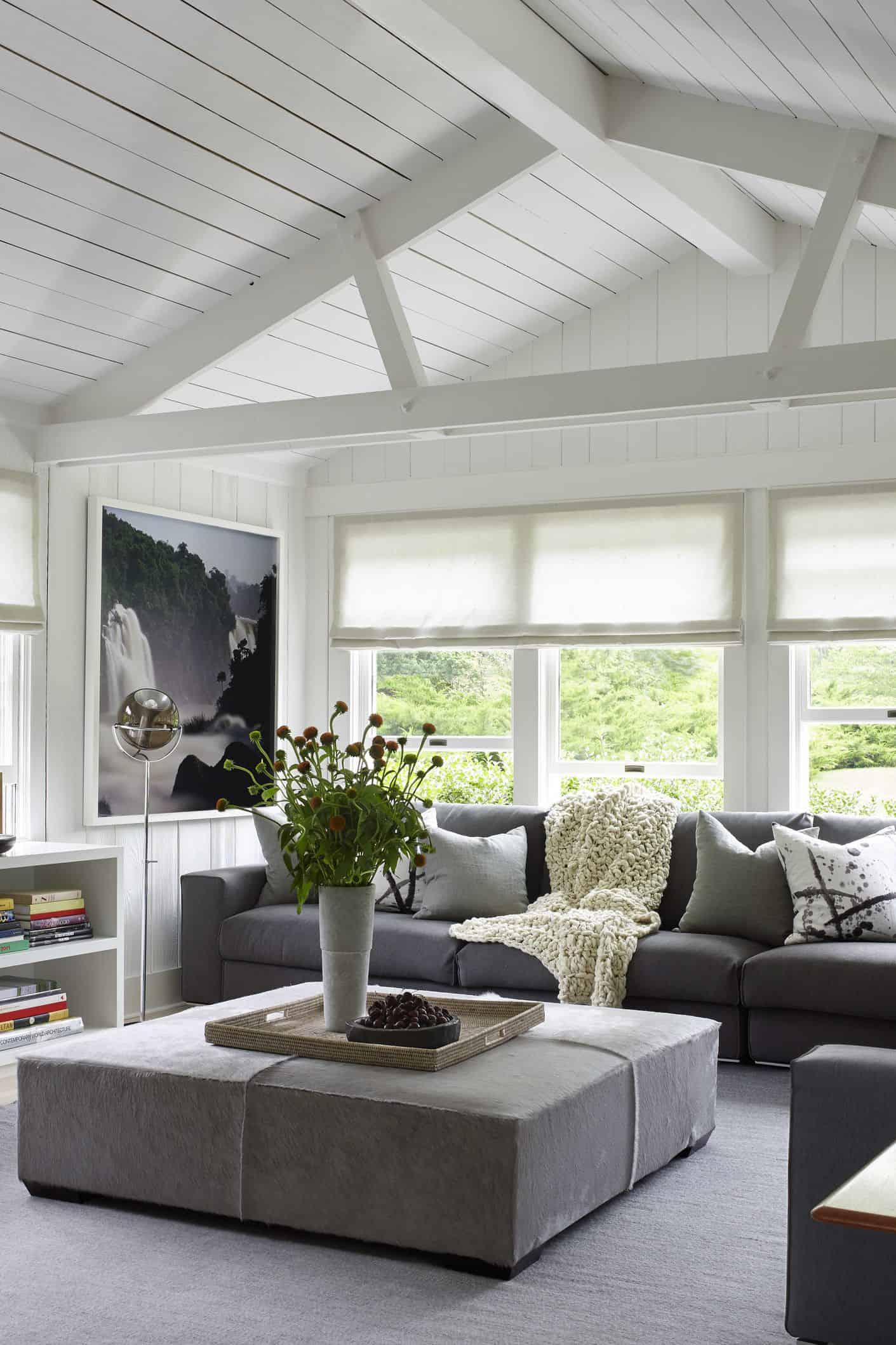 This East Hampton home design shuns the stereotypical beach house palette of white and navy. Also is an inspiration by Grey Gardens with all the elements.