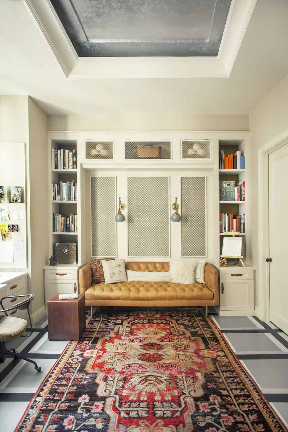 This living room features a Moroccan rug that catches the vibe of a fun, very alive in spirit and wild home.