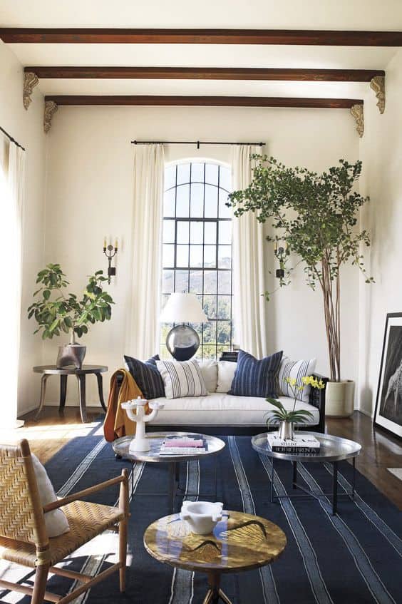 Blue and white living, room, blue striped rug, wooden and gold details… How can this not be one of the most wanted living rooms?