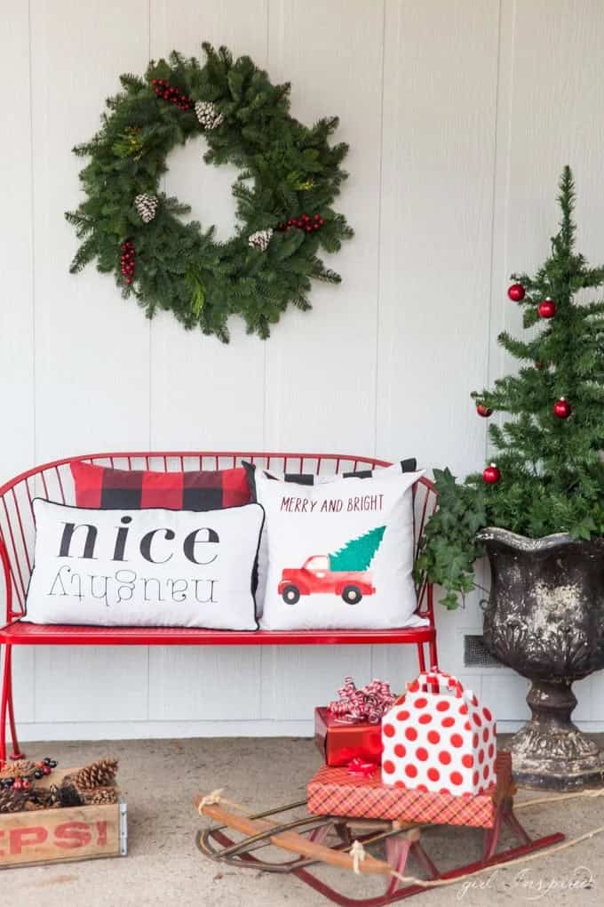 With your DIY Christmas outdoor decorations set up, add small touches to pull the entire look together. If you have a porch bench, add a festive holiday pillow or a small plaid blanket to make it cozy. Place a holiday-themed door mat at your entrance with a friendly message like “Let It Snow” or “Welcome Winter” to finish the look.