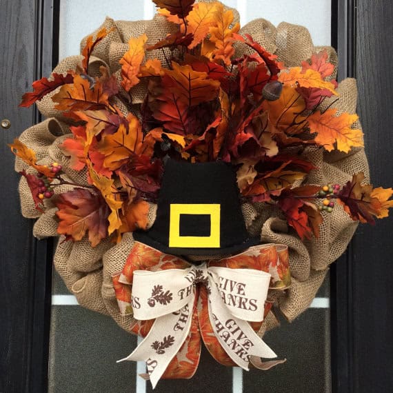 5. Pilgrim Natural Burlap Thanksgiving Wreath with Hand Made Pilgrim Hat