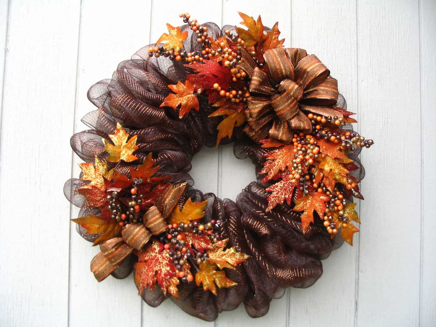 14. Luxurious Brown Metallic Deco Mesh Fall Wreath Door
