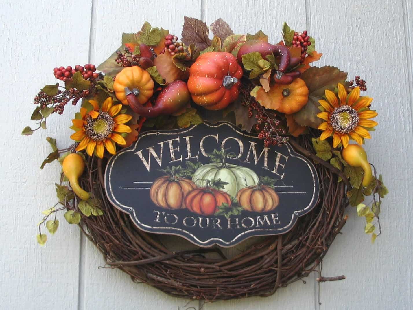 15. Welcome To Our Home Wooden Sign nestled in grapevine wreath surrounded with Fall Foliage