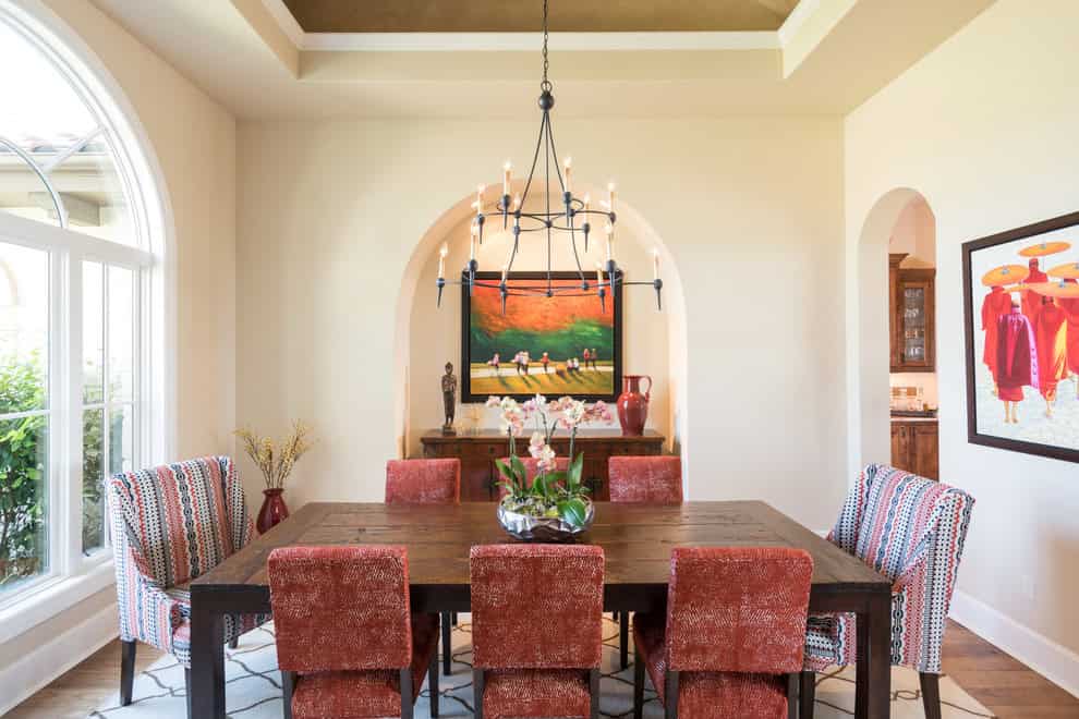 The design of the dining room often gets overlooked by simply choosing the table and chairs. But a dining room is not just made of the dining table and the chairs around it. There’s much more to it. It is a complete room, therefore it has its own decorative elements besides the functional ones. Most modern styles tend to combine the dining room and end up cramping it up with the kitchen or the living room but not the Mediterranean style. As everything else in this style, the Mediterranean dining room is as elegant as they come. There is plenty of space around a large table with more than enough chairs. The warm hues complement the ornaments that are typical for this style. You’ll be able to see all of that in the photos below.