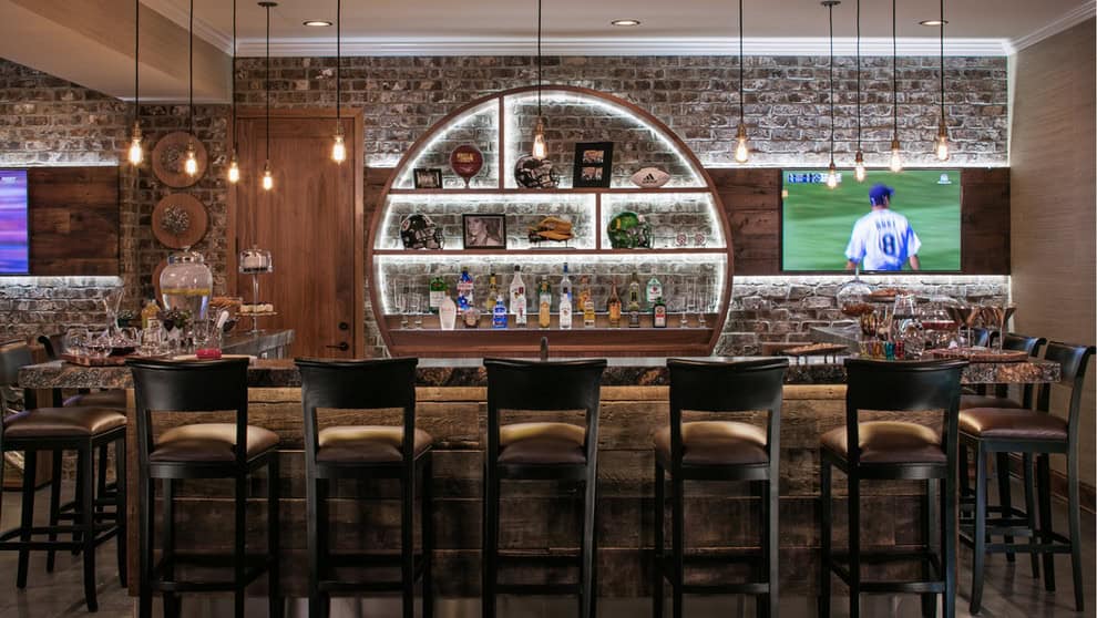 3. Brick Accents with Shuffleboard Basement Home Bar