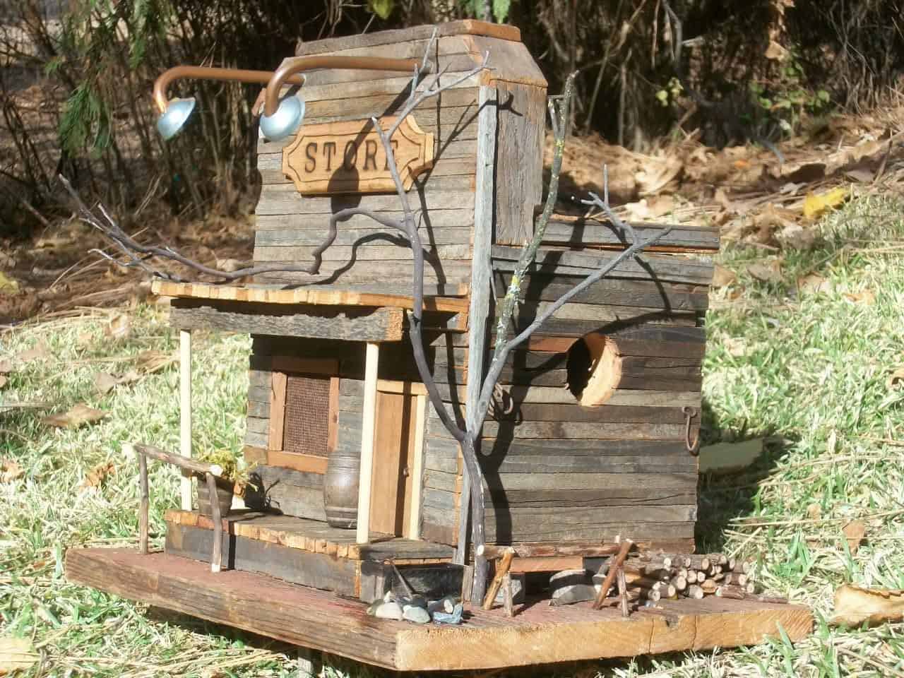 Old Western Solar Powerd Store front Birdhouse with light up lights and detailed yard