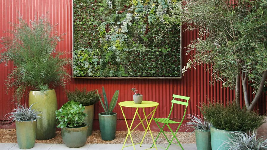 Here you can see how a bright green bistro pops right against a metal wall painted barn-red. You can turn any patio into a lush oasis by potting plants and a vertical succulent garden.