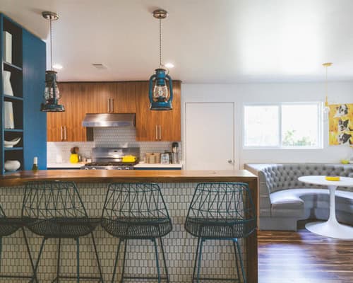 This Texas family wanted the kitchen to have an eclectic feel, and these lanterns fit the bill. They found them at a local antiques mall and had them converted into pendant lights. They pair well with the blue cabinets and row of blue bar stools.