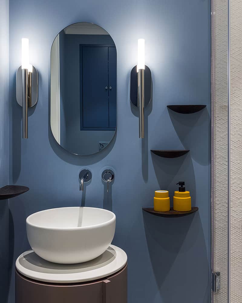 In this blue bathroom, the stainless steel details give it a very luxurious atmosphere. We note in particular the two wall lights, very graphic, which dress the wall on either side of the mirror. We love the small wall shelves, perfect for organizing a minimalist bathroom!