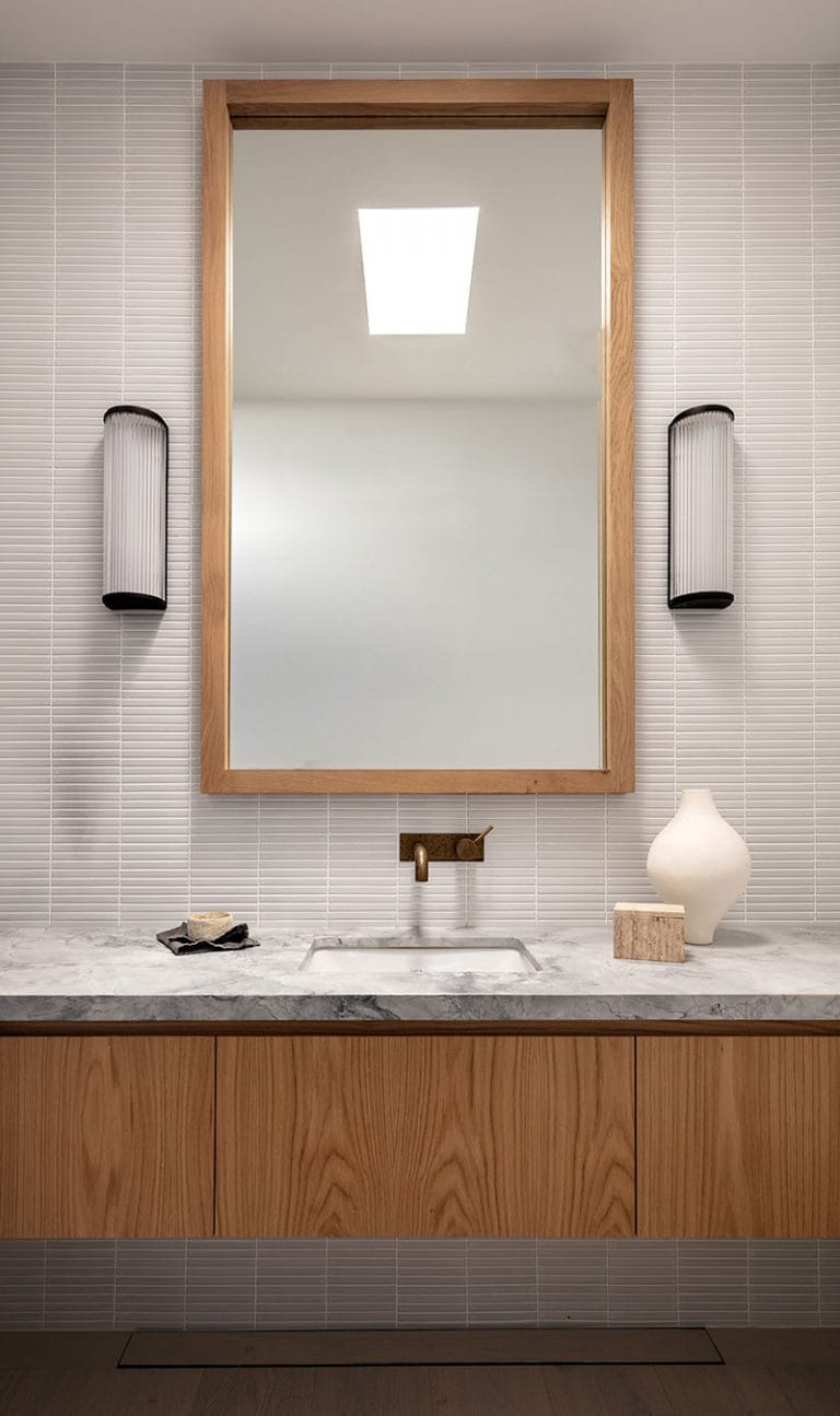 A bathroom decorated in wood and white: a classic, timeless choice that works all the time! Here, a marble worktop brings even more texture to the whole.