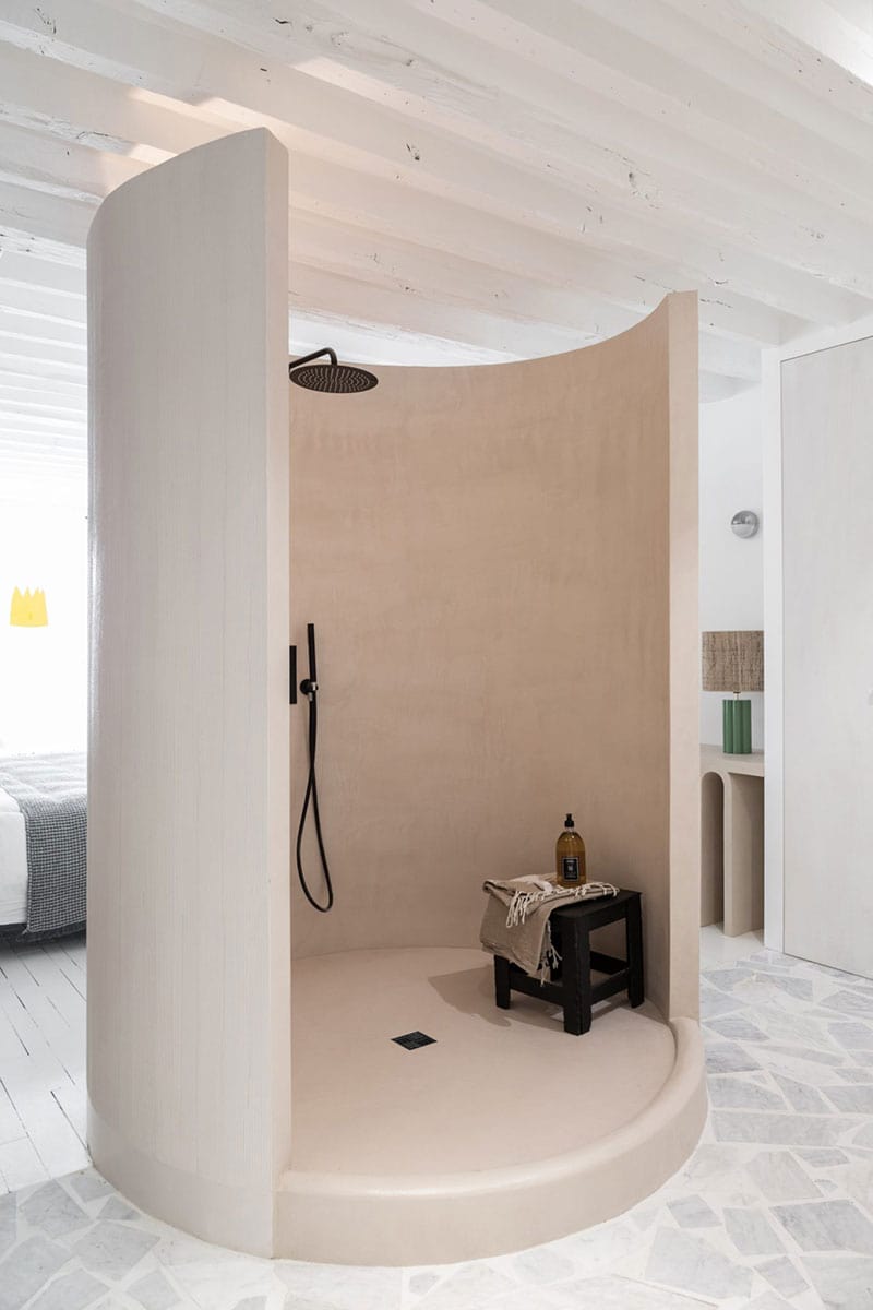 Perfect for the development of a studio or a master bedroom, the installation of a shower in an alcove is a good decoration idea to create an intimate corner in a living space. Here, the rounded shape gives it a lot of softness, and the black taps bring contrast and modernity.