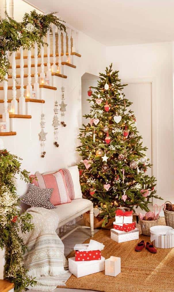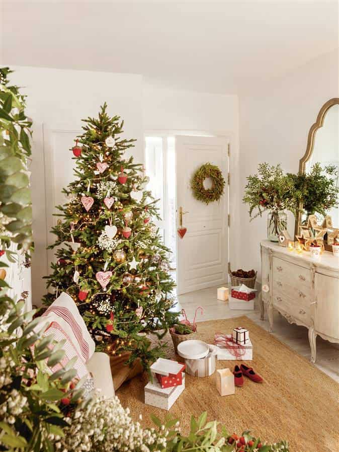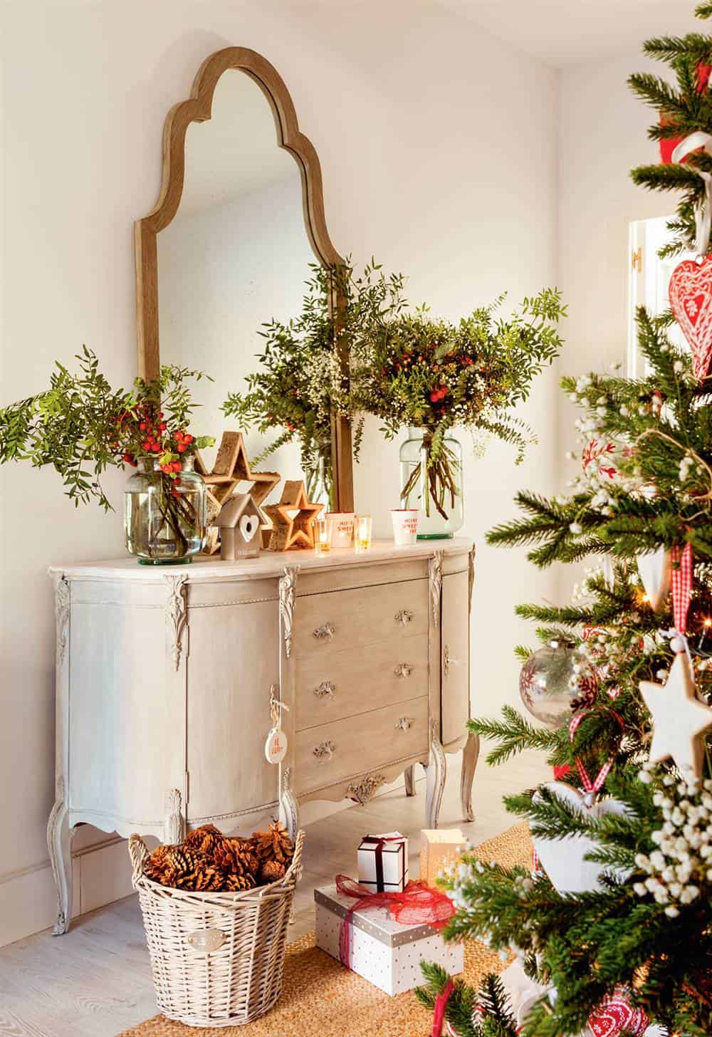 Upon entering this house we are surprised not only by its decoration, natural and full of life but also by its perfume. It is given off by the baby blue eucalyptus which, intertwined with the mastic, decorates every corner of the hall. Eucalyptus is perfect for Christmas because of its appearance and its perfume. Besides, it stays fresh for a couple of weeks and when it dries, it does not lose leaves or fruit. Its white decoration made them choose the small white flower of the paniculata to mix with the green branches in a garland that runs along the railing of the staircase. And to give it a more Christmas look, they added reddish rose flowers. How did they assemble it? With a wire to which the branches were strung with green ties and ropes. And to accompany it, pineapples, candles, glass balls, and white and light wood ornaments.It is not essential to decorate the tones of all the arrangements with the decoration. Play because nature is full of colors! and everything combines!
