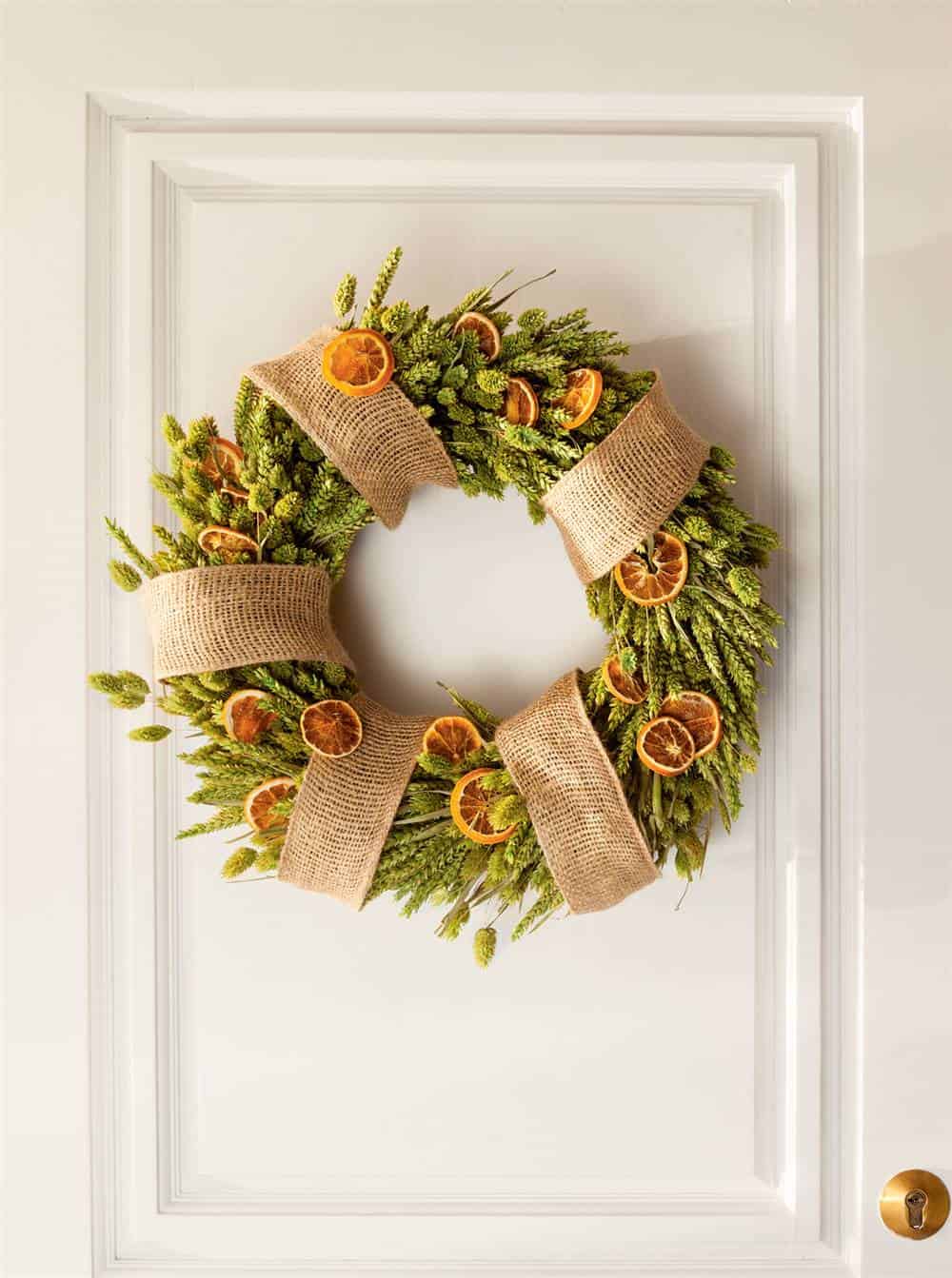 Surround a wreath of hay or branches with a wire in a slightly closed spiral. Fasten wheat branches and poised feathers to the wire, decorate with a jute ribbon spiral, and glue some dried orange slices.