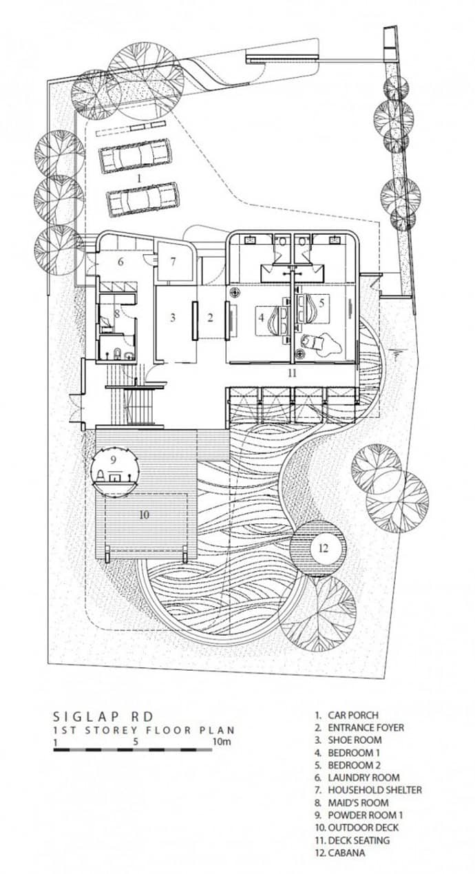 At the ground level, two resort-style ‘cabana’ bedrooms open directly onto the poolside terrace, making this zone ideal for parties and relaxation. Timber decks and rooftop gardens above help insulate the structure from solar heat gain, contributing to sustainable comfort in Singapore’s tropical climate.