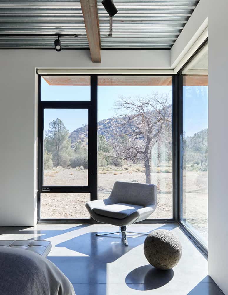 Inspired by the concept of tents gathered around a campfire, the layout of Sawmill Retreat consists of three wings radiating from a central hearth. This main living space serves as the social heart of the home, featuring a dramatic 12-by-26-foot retractable window wall that, when opened via a hand-turned wheel, blurs the boundary between interior and exterior and transforms the adjacent patio into a fourth “tent.”