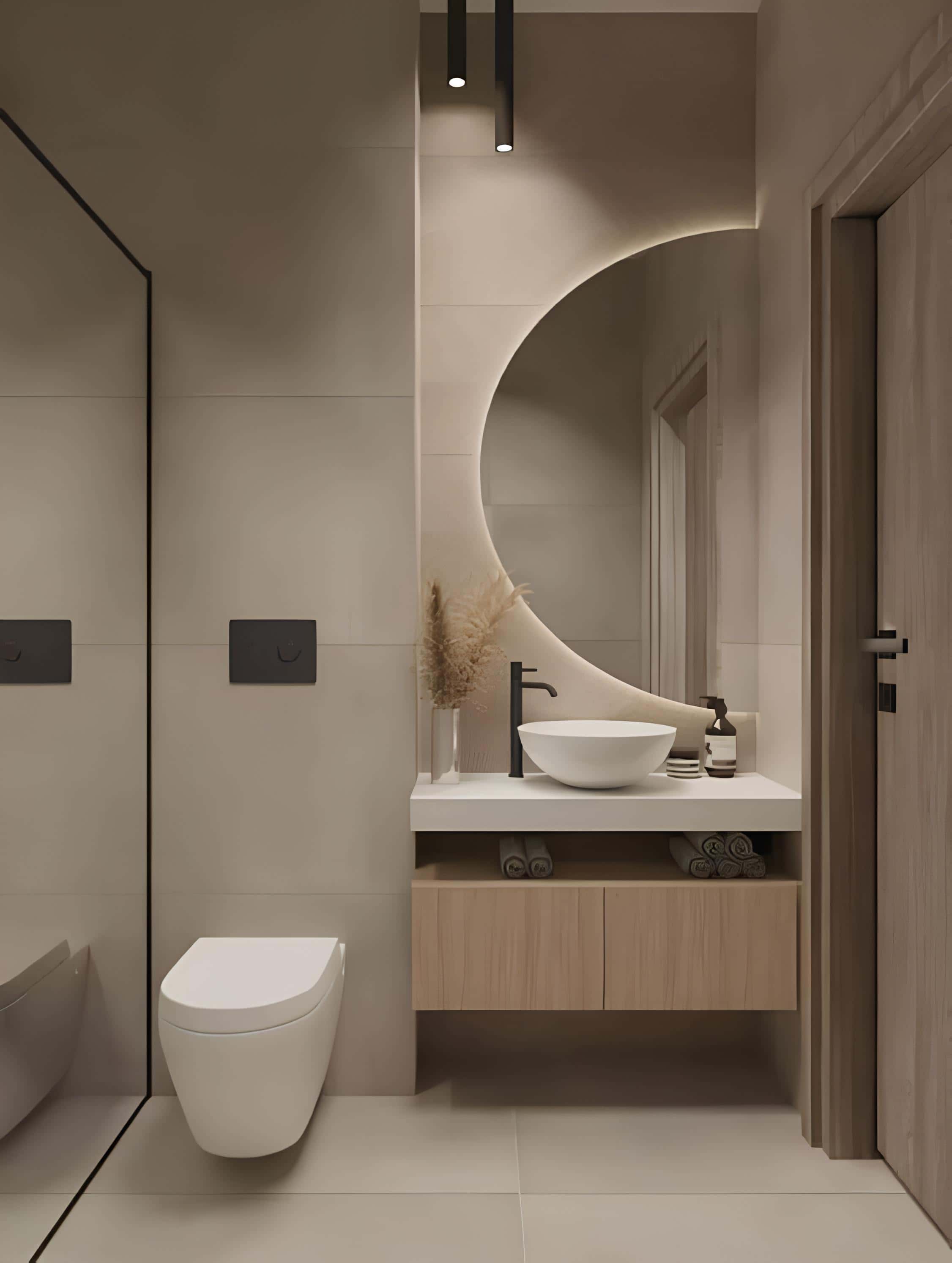 Minimalist bathroom design with a curved mirror, wall-mounted toilet, and soft lighting.
