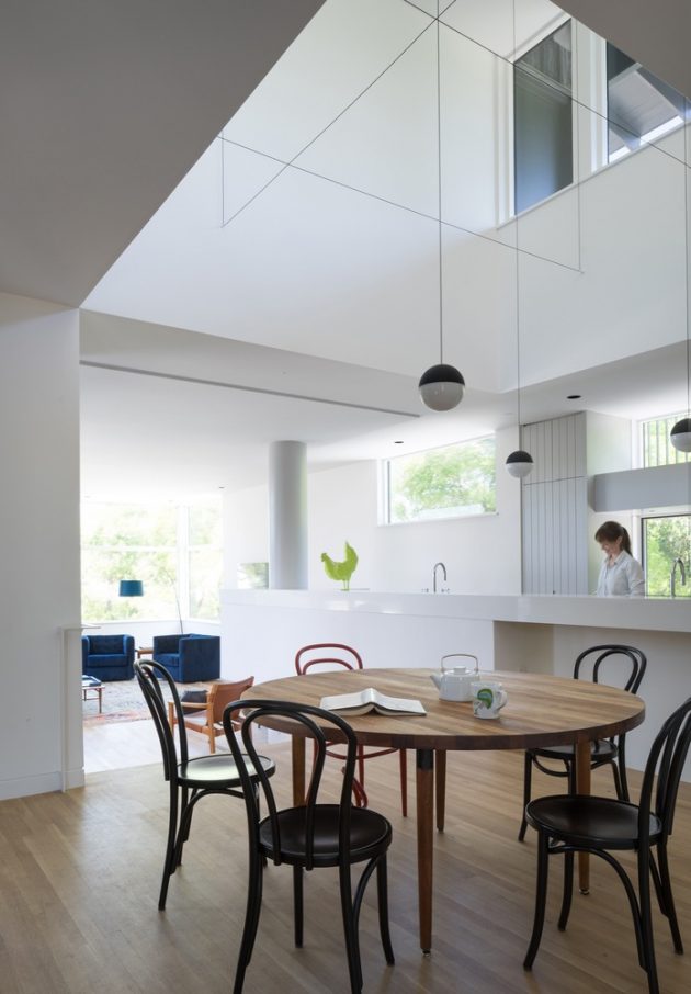 porch projects out to capture prevailing breeze and afford uninterrupted views through the site.At the center of the home, a large multifold door shared by kitchen/dining and porch can be opened