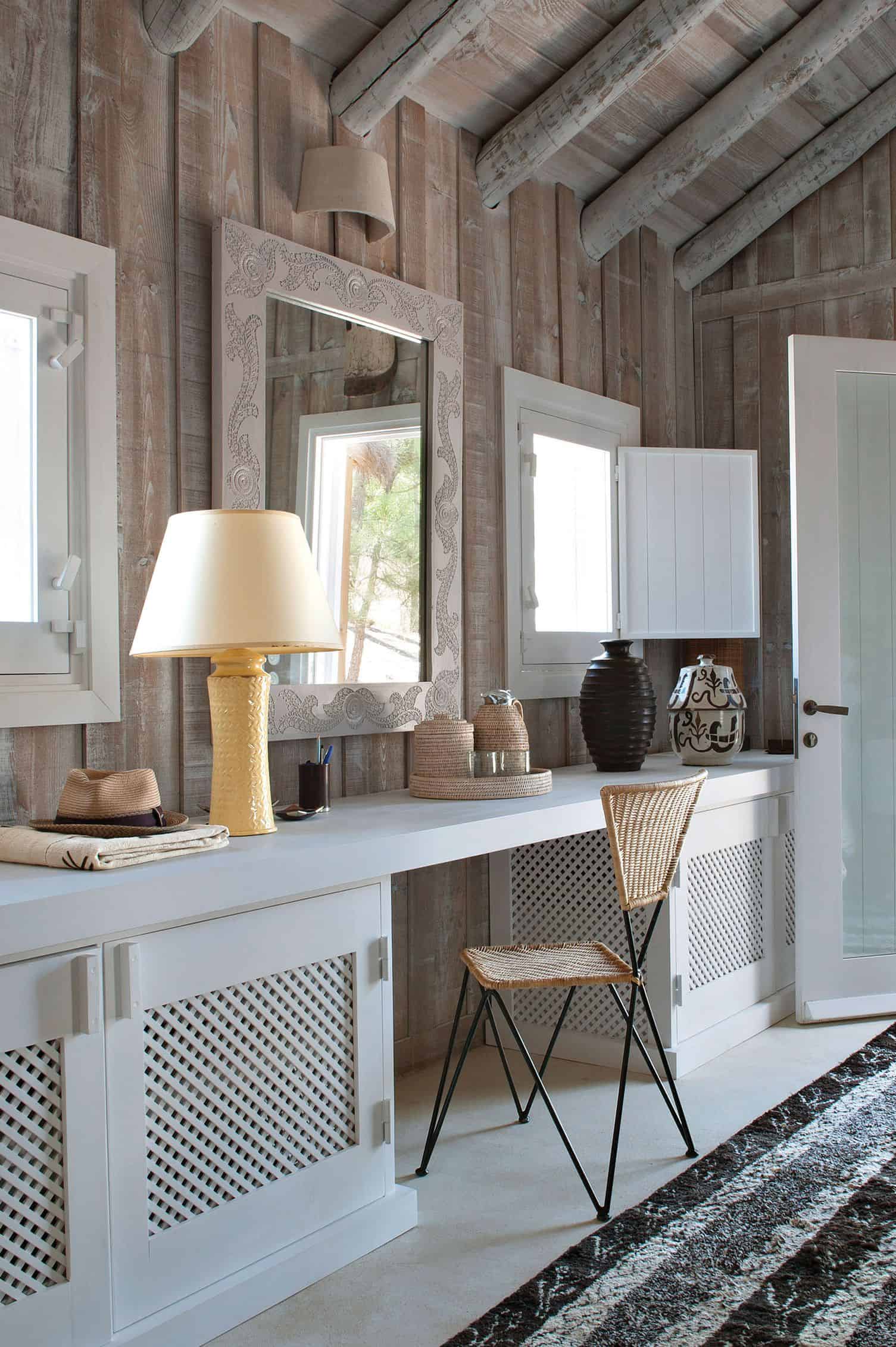 The secluded getaway in Therassia you can enjoy the wool pillows and the cotton rugs that are handwoven in Greece, since this is a speck of an island off the cost of Greece. We are really into the handmade floors that are a mix of white cement and sand.