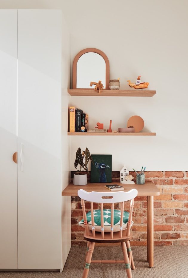 On ground floor the single storey front room acts as a living room, study and guest bedroom on occasion. The laundry and bathroom are central to the plan and a small service courtyard allows views and air from the shower.  The garden and northern light is directly accessed from the kitchen and dining space.  The opportunity to lounge in this space is also achieved through a sofa and the cushioned L shape banquette seat. Upstairs is a second bedroom and the two bedrooms for our clients and their teenage daughter.