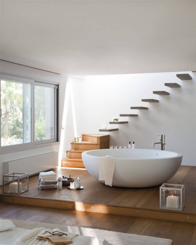 A freestanding bathtub is already a claim for the eyes, but if, in addition, it is located in a prominent space, its role will escalate positions, as in this minimalist and cozy bedroom with a bathtub.