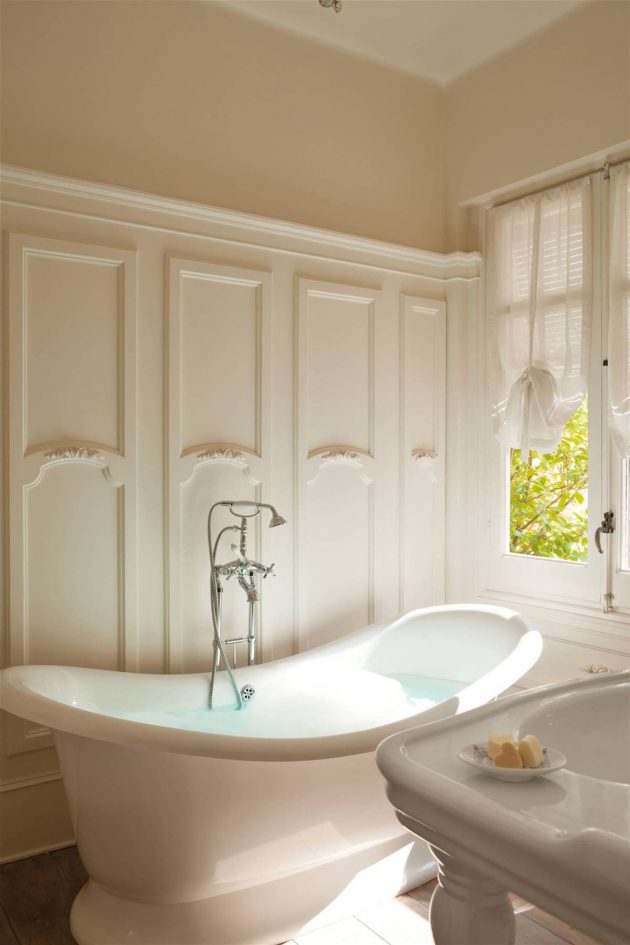 The style of the bathtub, together with the wall covering moldings and the original curtains, bring the warmth to this pure white bathroom bathed in light.