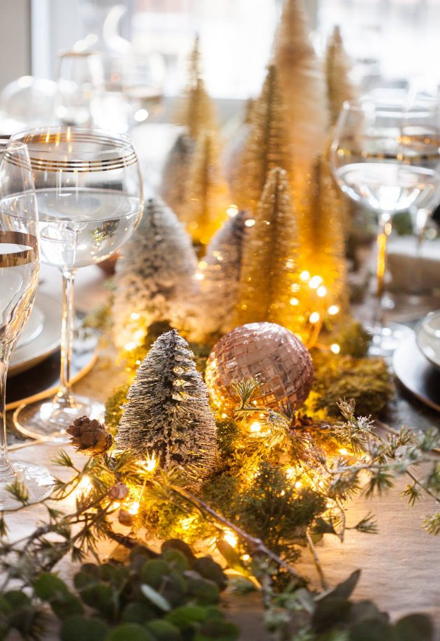 A magical and golden pine forest. That was the idea when creating this original Christmas centerpiece. For this, ornaments in the form of leaves and trees were combined, with a point of snow. Lights always have a hole. We love!
