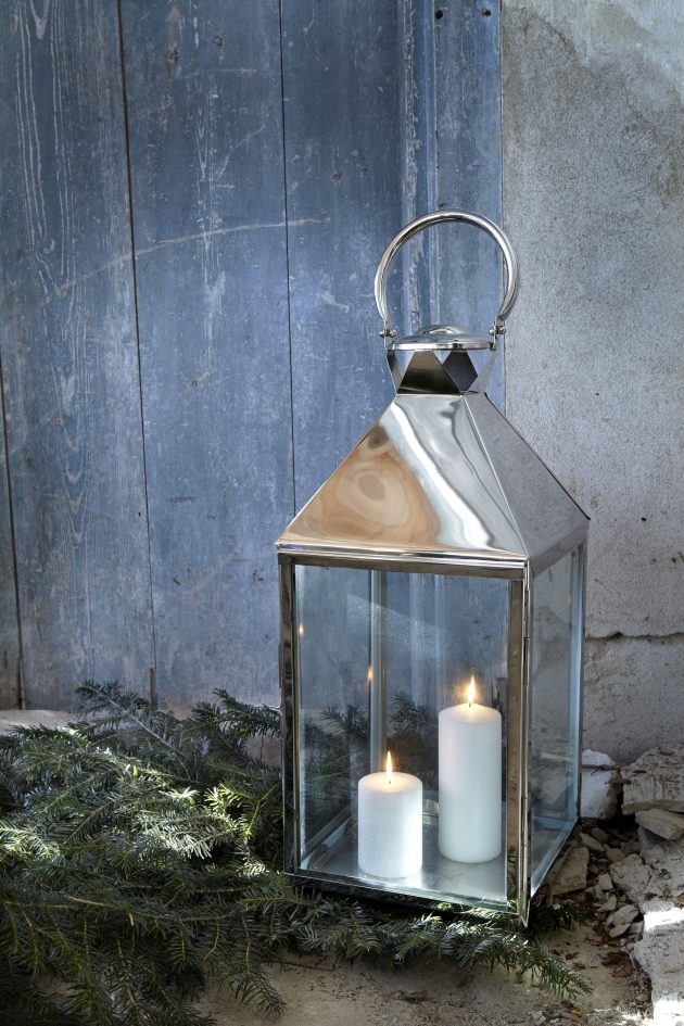 Make it clear that it is Christmas from the door of your house. Place a candle inside a beautiful glass lantern, so you will avoid it going out and, at the same time, the flame will always remain in sight. Complement the presentation with a fir branch so typically Christmas.