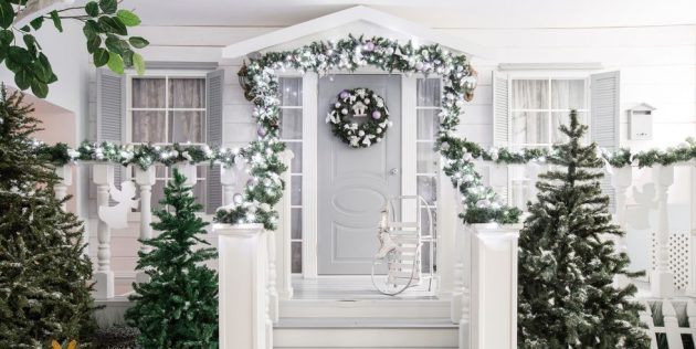 Around the door-frame you can add an elegant wreath, drape garland and to finish the look place a potted plant on your step for even more of a statement.