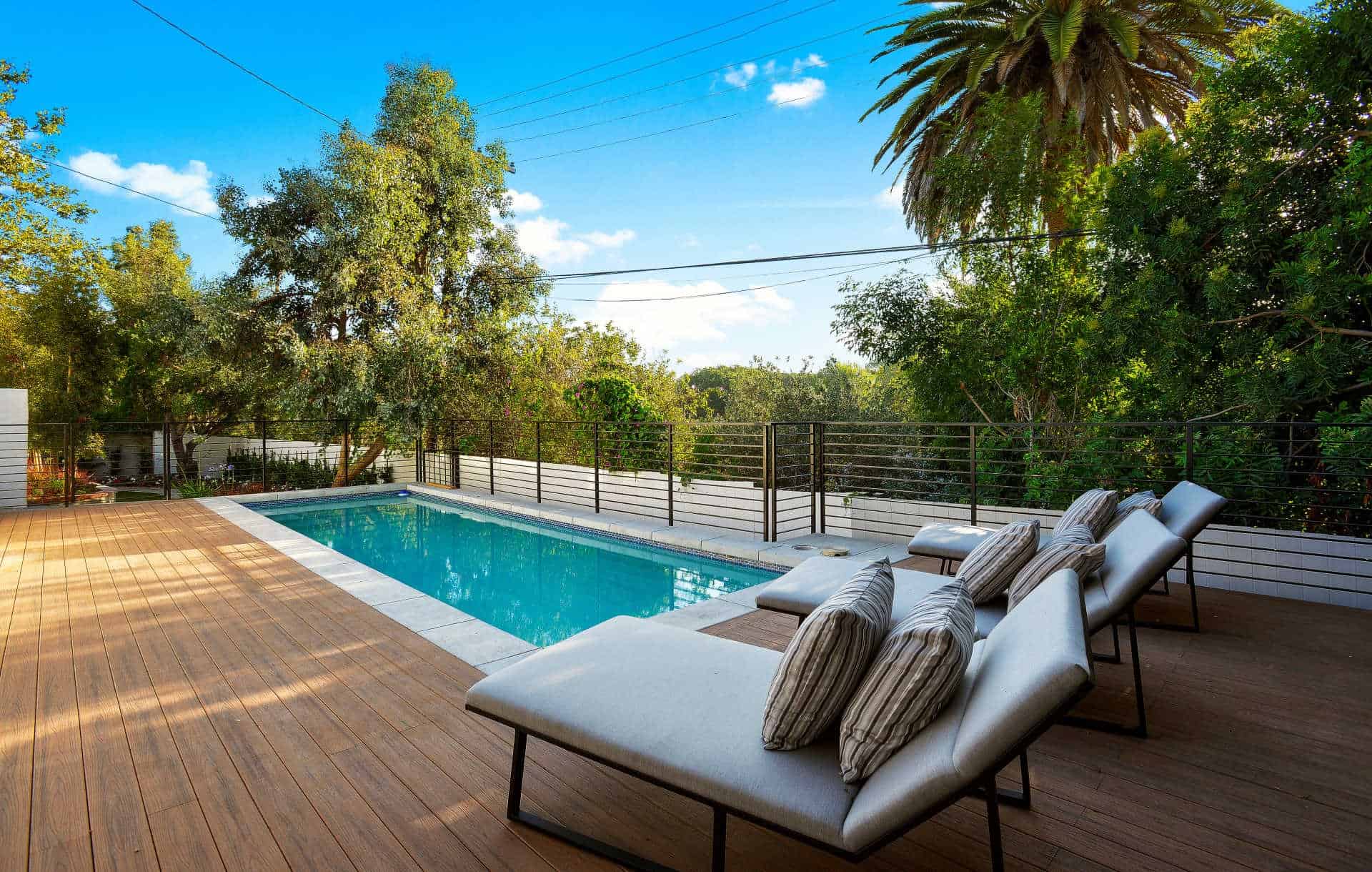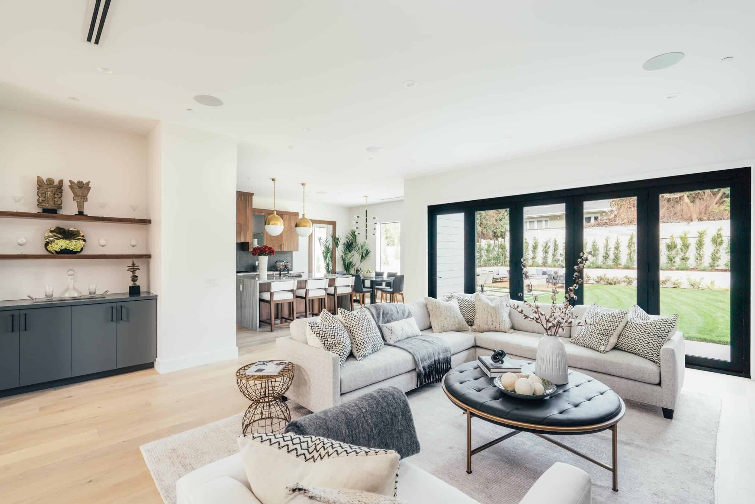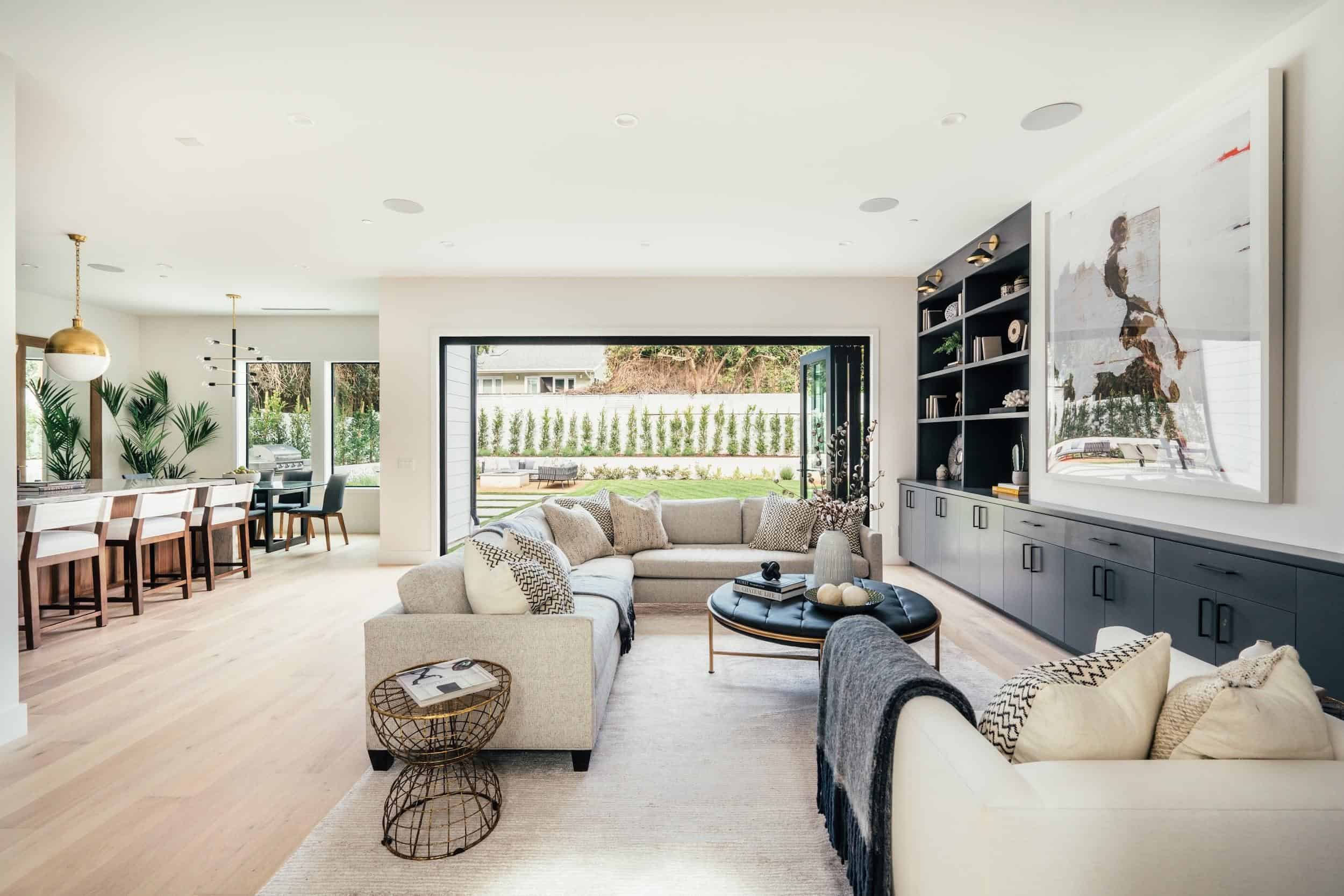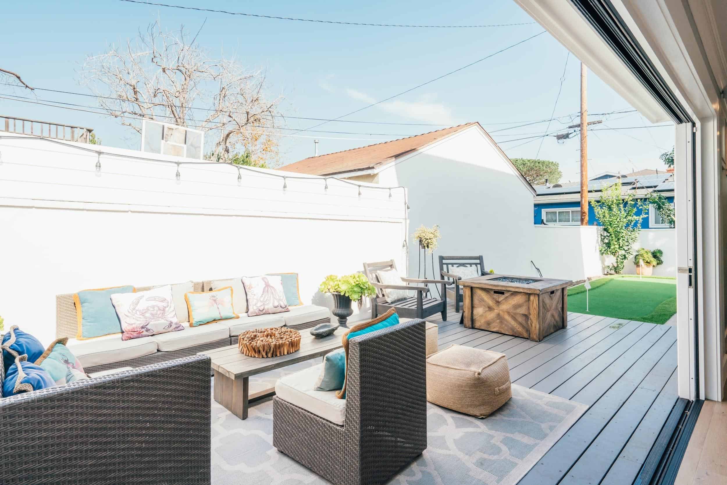 There are various ways to seamlessly make the outside space feel more like the inside. String lights or chandeliers to create the illusion of a ceiling and to add in ambient lighting, take advantage of pocketing patio doors, and use simple elements like rugs and accessories to create a sense of an outdoor “room.”